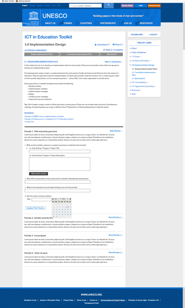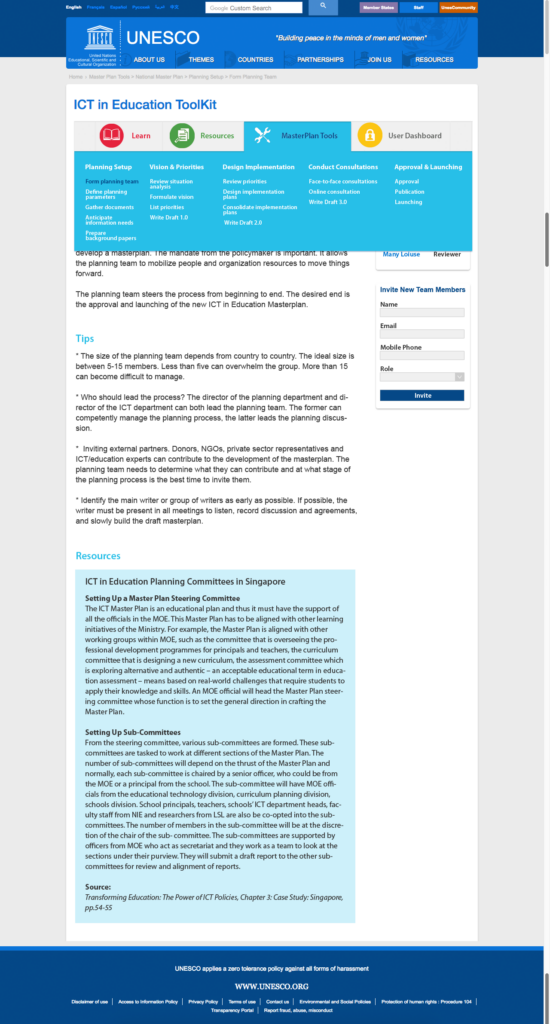 Provide UNESCO with information design, UX strategy, light project management, functional requirements gathering, sitemaps, wire frames, and UI designs, for an online educational toolkit (LMS) to be adopted by master educators and educational policy makers worldwide.